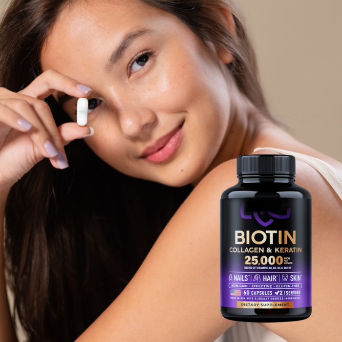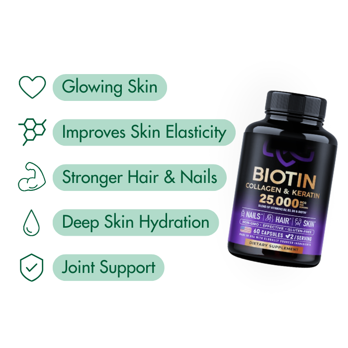 Biotin is a B-vitamin that helps support hair and nail growth, while collagen is a protein that provides structure to the skin, hair, and nails. Keratin is a protein that forms the main structural component of hair and nails.